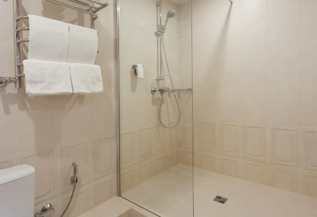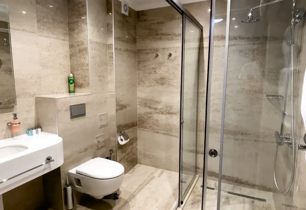 Современная душевая кабина, много умывальных принадлежностей (шампунь, кондиционер, гель для душа, молочко для тела, ватные, диски, палочки, бритвенный набор, зубная паста и щетки). Пополняли ежедневно.