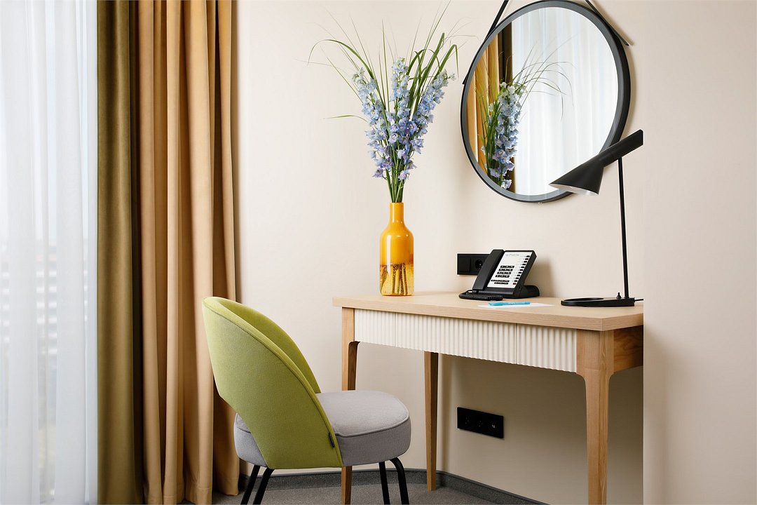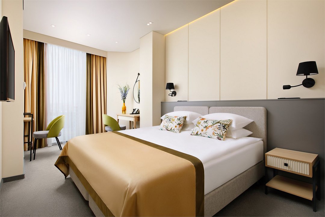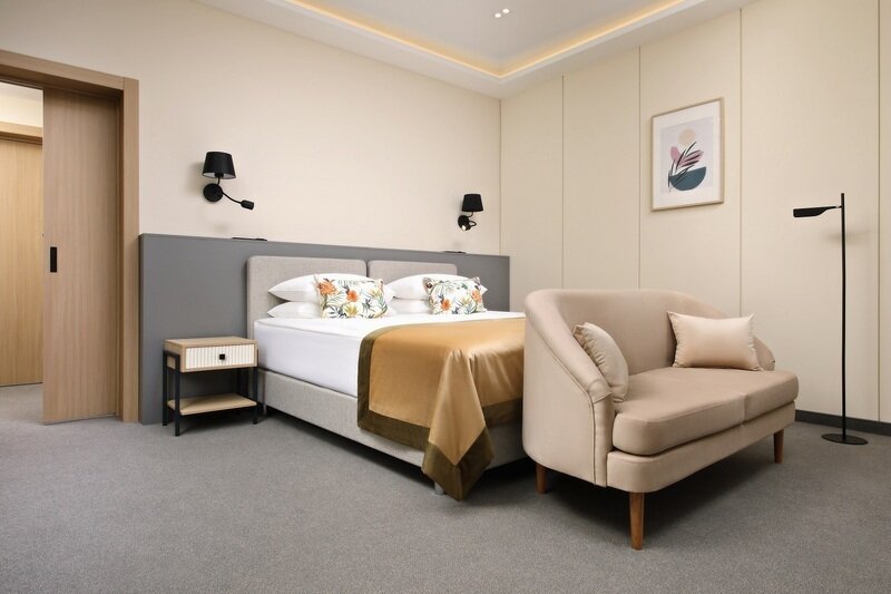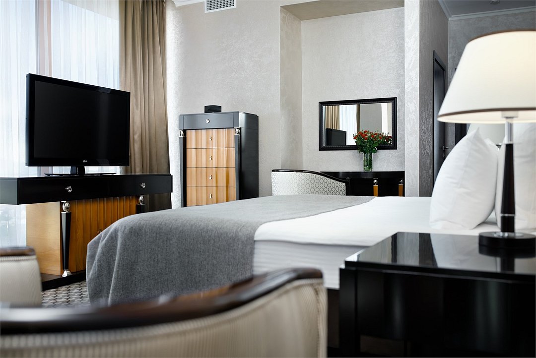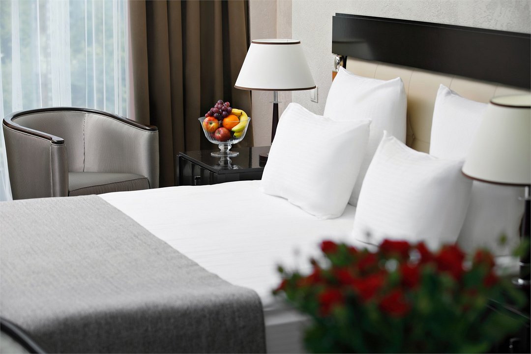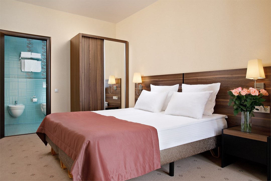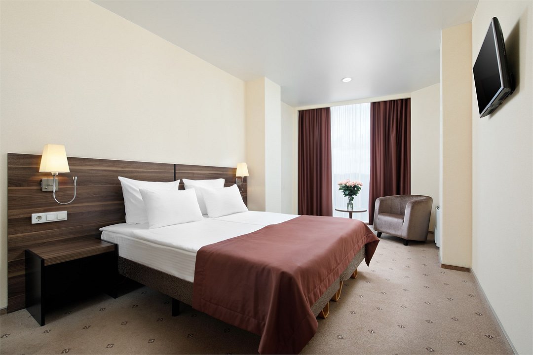 Особенности номера: элегантный однокомнатный номер улучшенной категории, состоящий из просторной спальни и большой ванной комнаты, предназначен для одноместного или двухместного размещения.