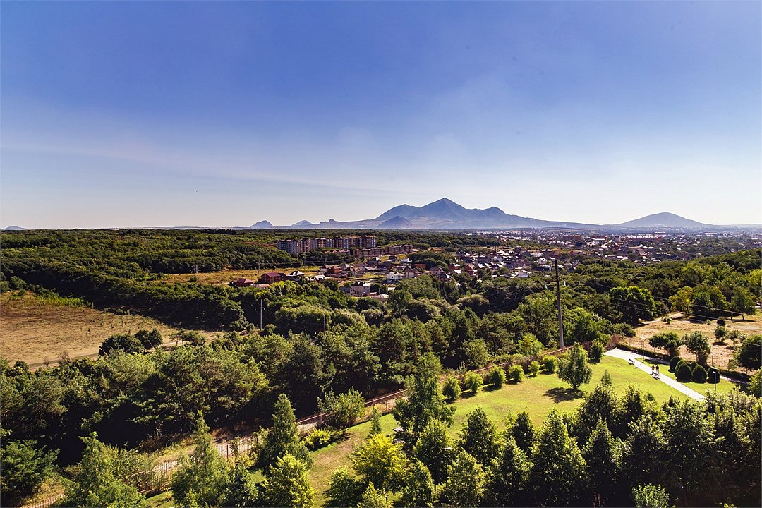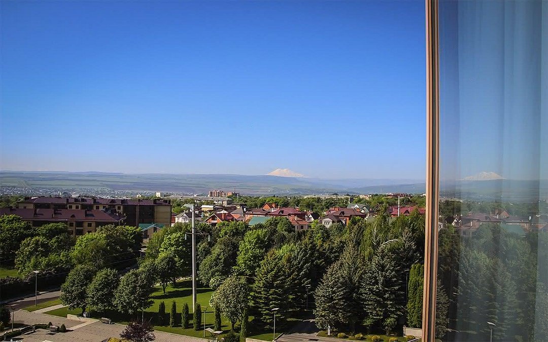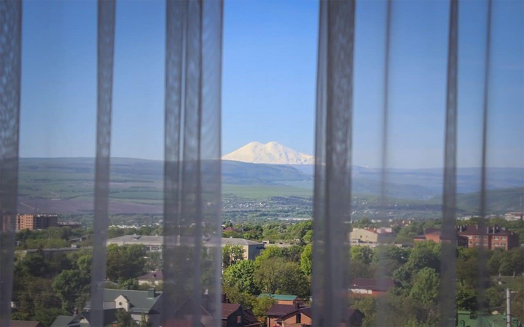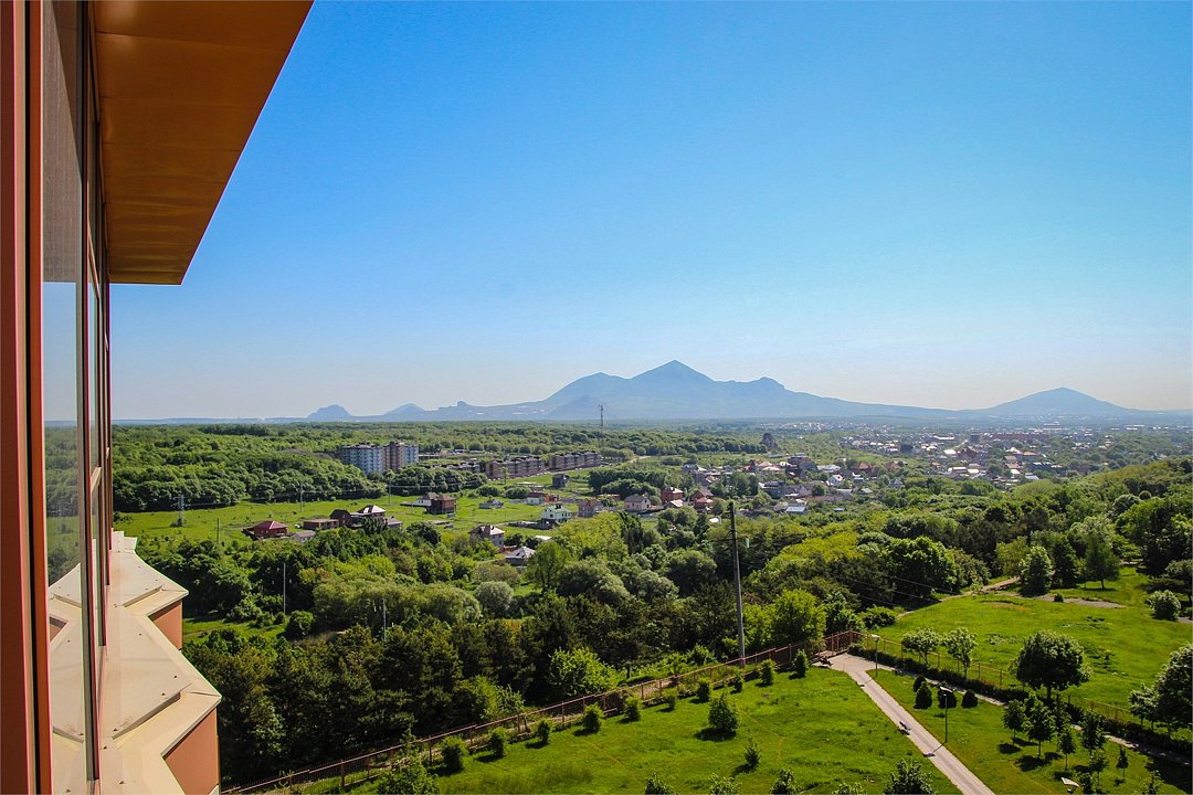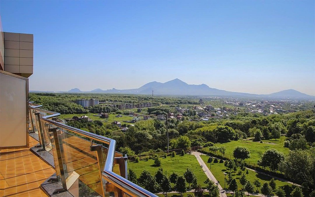Вид из окон: юг — бесконечная цепь снежных горных вершин (Главный Кавказский хребет) и гордый Эльбрус. Север — завораживающие горы-лакколиты и живописные пейзажи предгорья Кавказских Минеральных Вод.