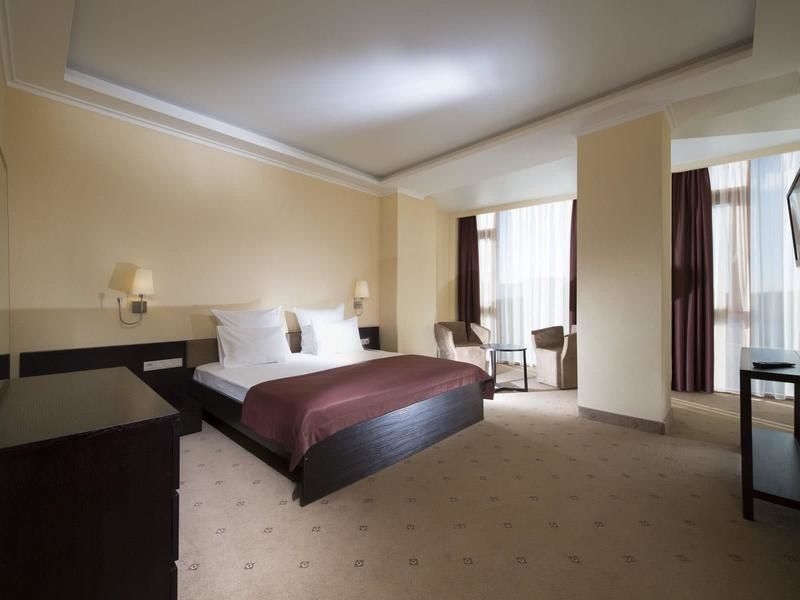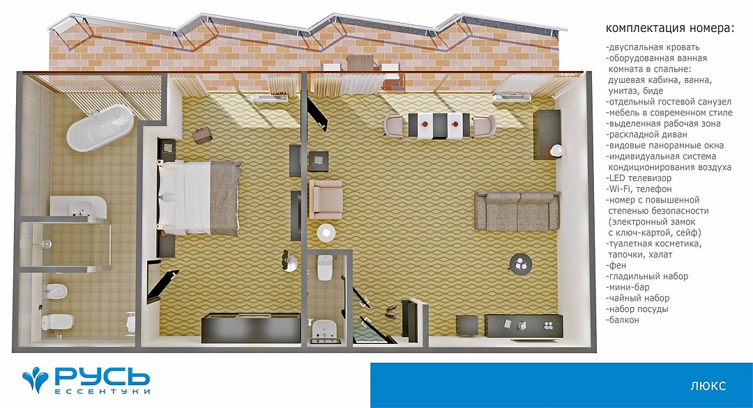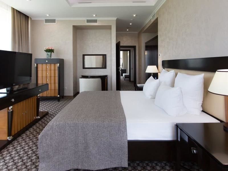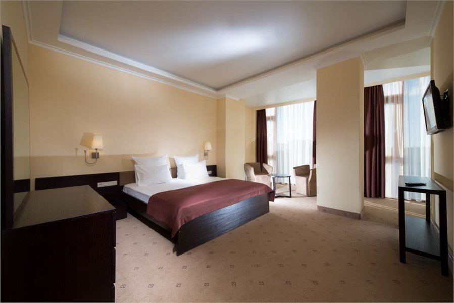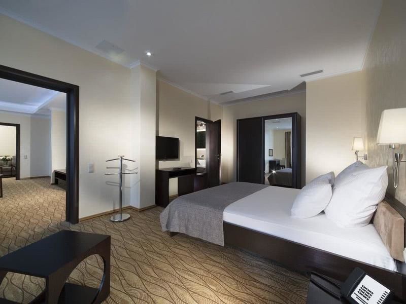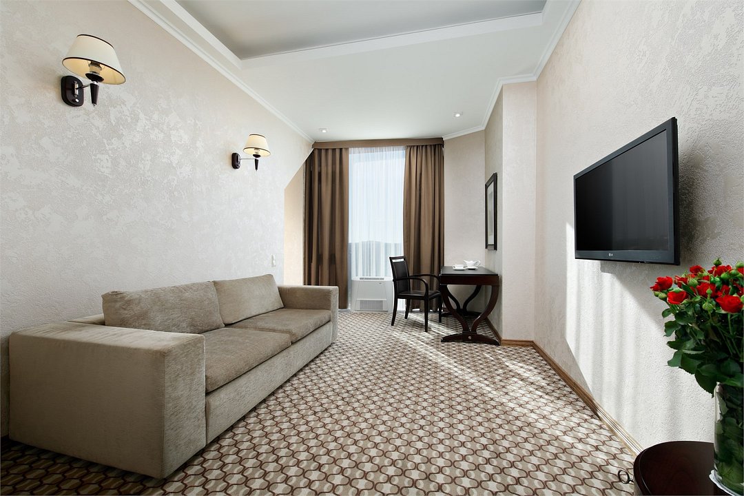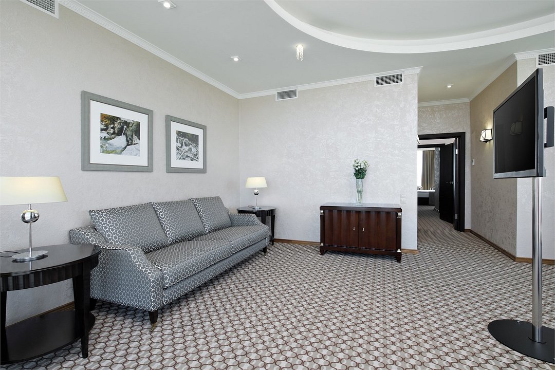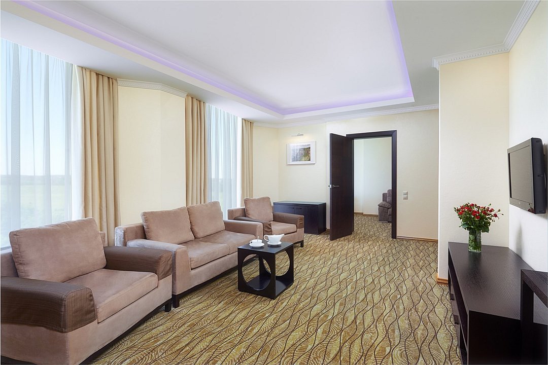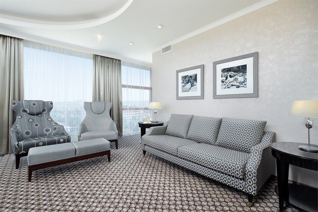 Максимальная вместимость номера составляет четыре человека. Размещение: в номере имеется большая двуспальная кровать в спальне и диван-софа в гостиной. Вид из окон: через панорамные окна номера открывается восхитительный вид на две стороны: север и восток — горы-лакколиты и необъятные степи Кавказских Минеральных вод, юг и запад — Главный Кавказский хребет и самая высокая вершина Европы — Эльбрус.