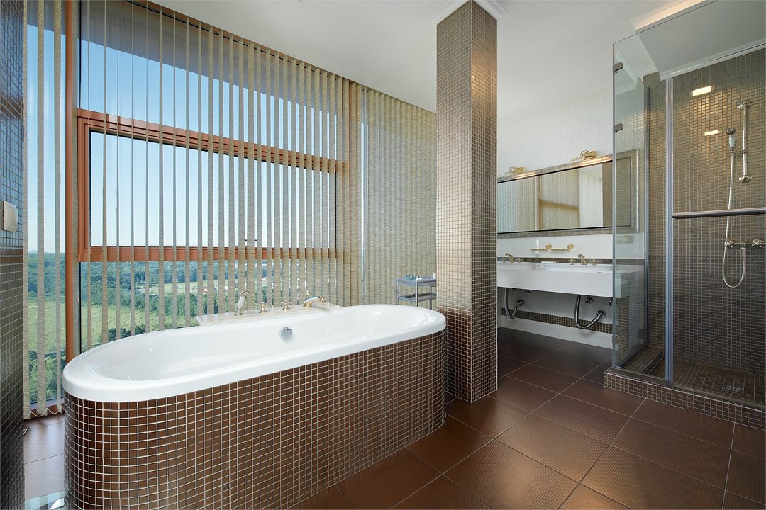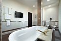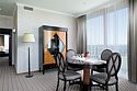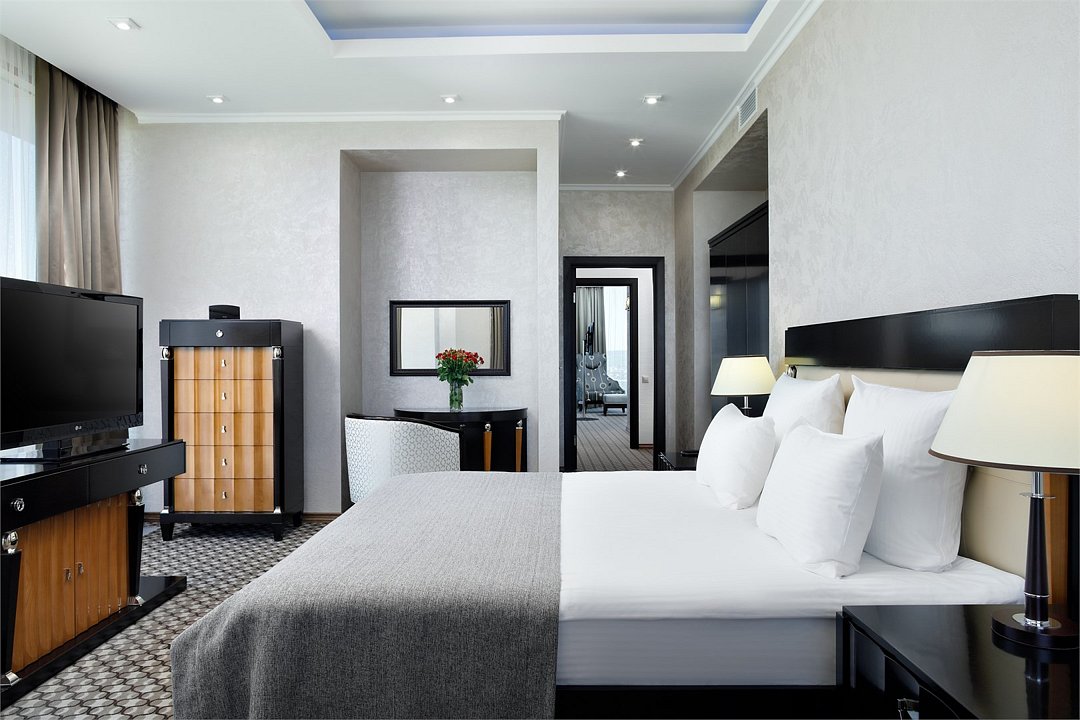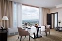 Особенности номера: двухкомнатный номер, состоящий из уютной гостиной и комфортабельной спальни. Имеется балкон. Номер оборудован двумя раздельными санузлами. Ванная комната оборудована шикарными окнами в пол и удобной ванной, из которой можно любоваться городом с высоты птичьего полета.