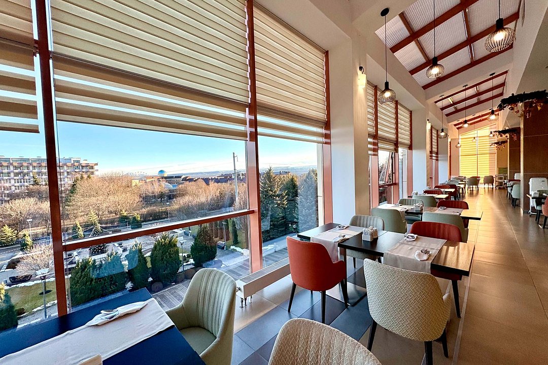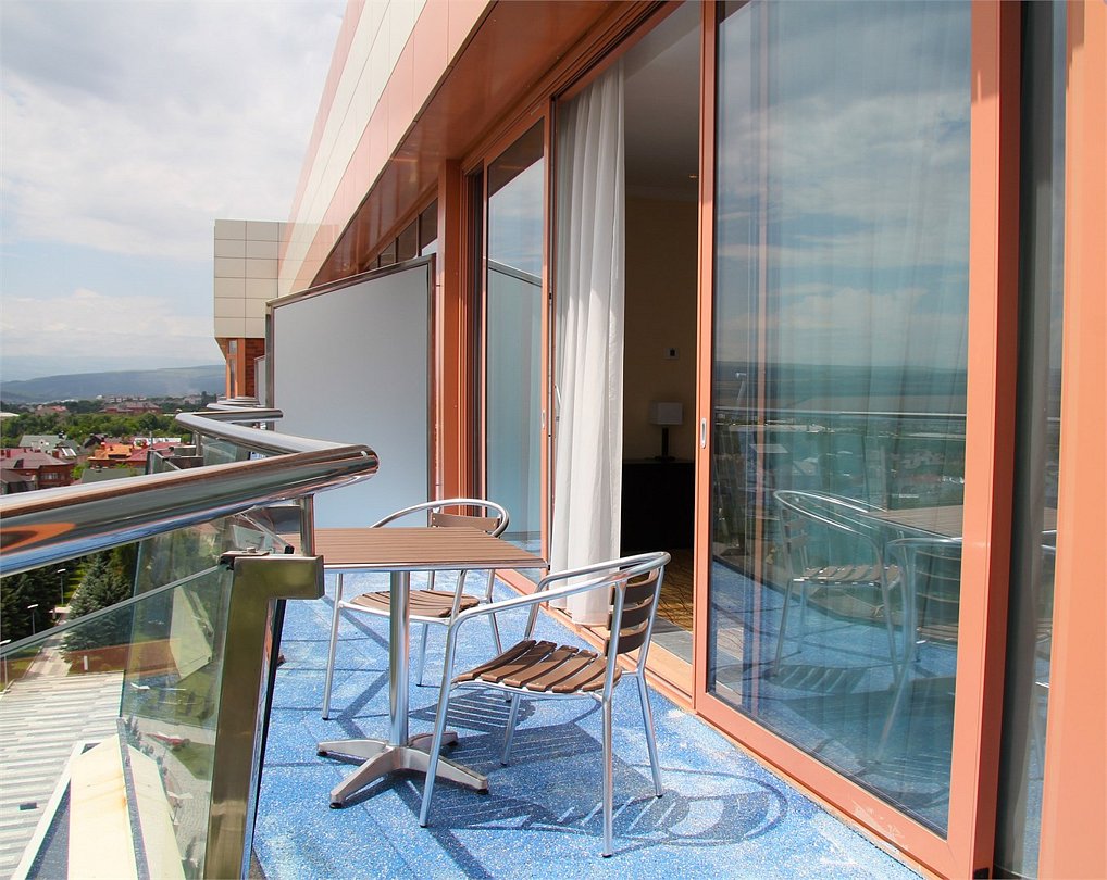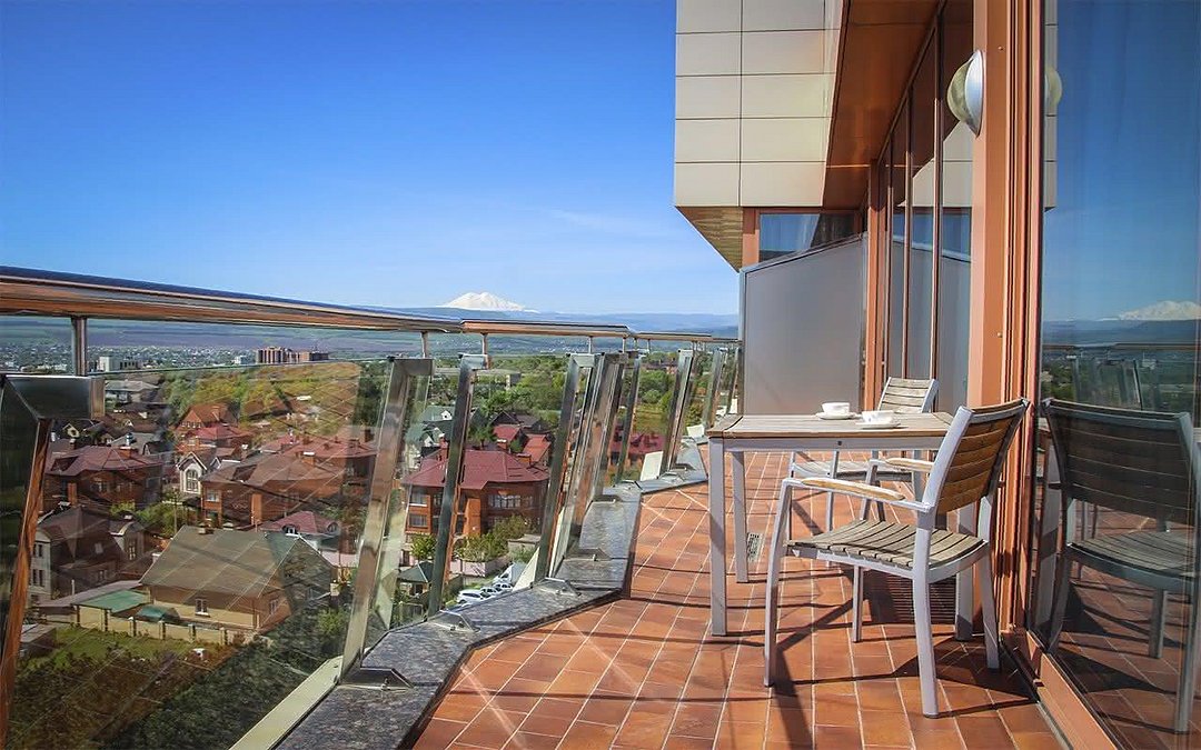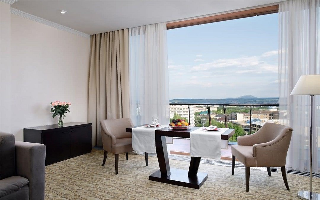 Вид из окон: из панорамных окон номера открывается потрясающий вид на две стороны: север и восток — горы-лакколиты и бескрайние степи Кавказских Минеральных вод, юг и восток — Главный Кавказский хребет и высочайшая вершина Европы — Эльбрус.