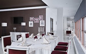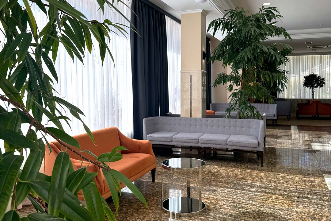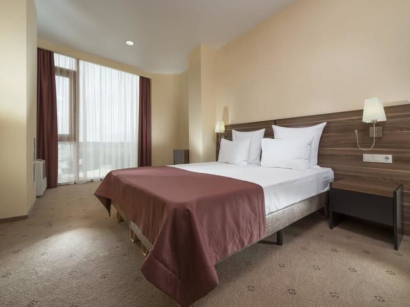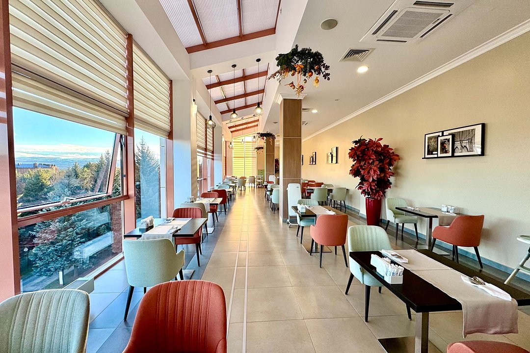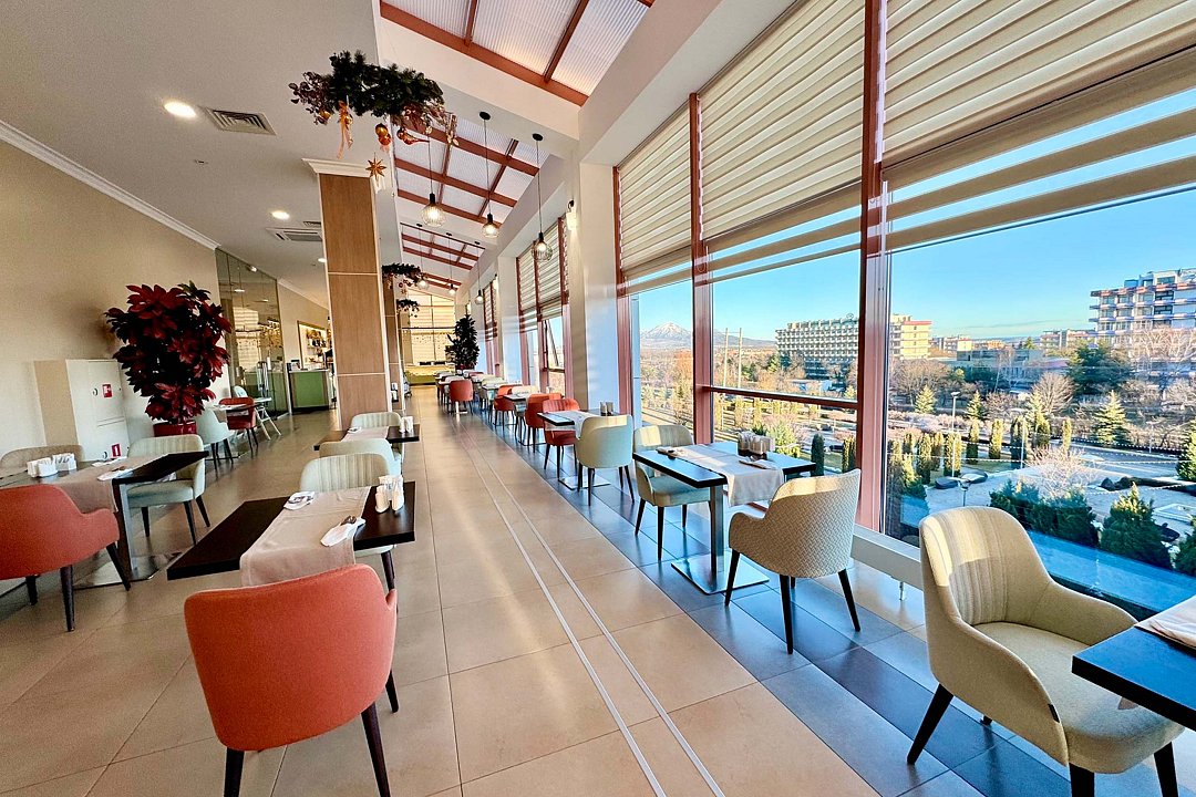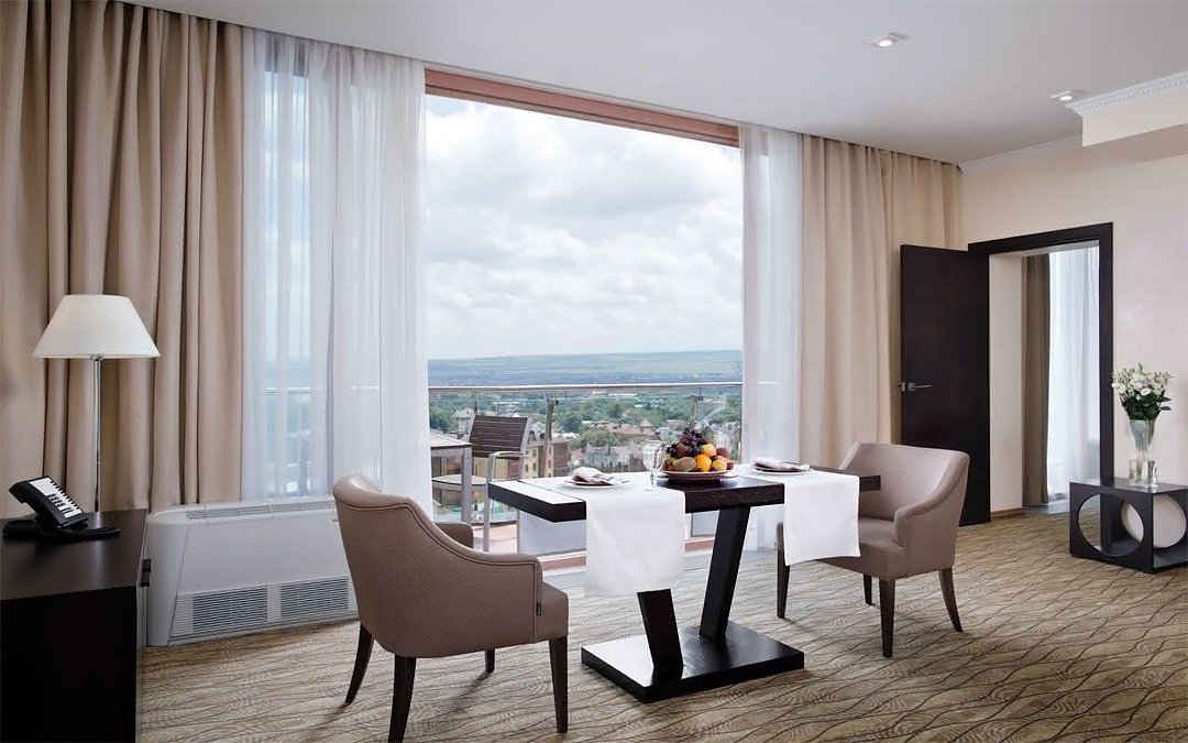 Вид из окон: из панорамных окон номера открывается потрясающий вид на две стороны: север и восток — горы-лакколиты и бескрайние степи Кавказских Минеральных вод, юг и восток — Главный Кавказский хребет и высочайшая вершина Европы — Эльбрус.