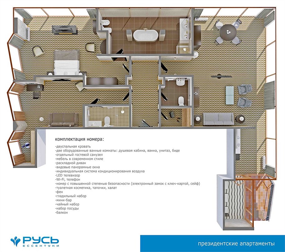 Номер оборудован двумя отдельными ванными комнатами и гостевым санузлом. В номере могут разместиться до четырех человек. В спальне установлена большая двуспальная кровать, а в кабинете — раскладывающийся диван. Также есть возможность установки детской кроватки.