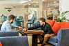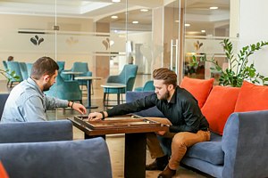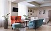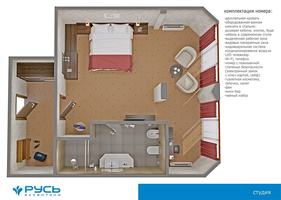Номера-студии имеют одну двуспальную кровать. Пространство студии имеет функциональное разделение на зоны работы и отдыха.