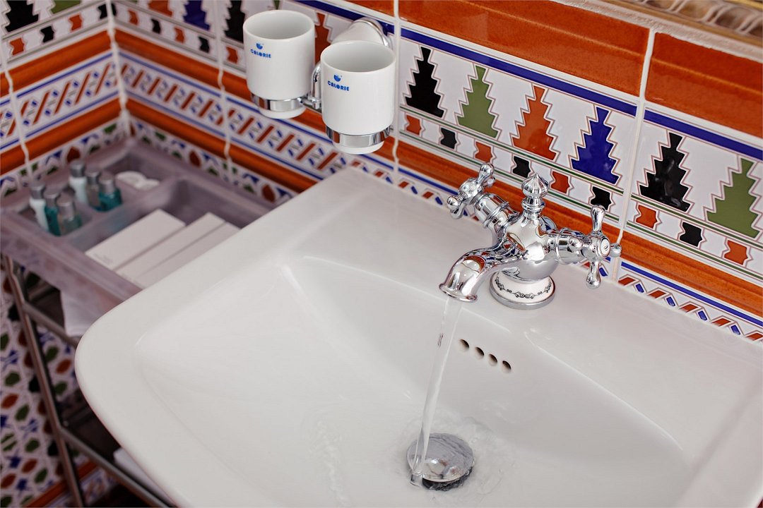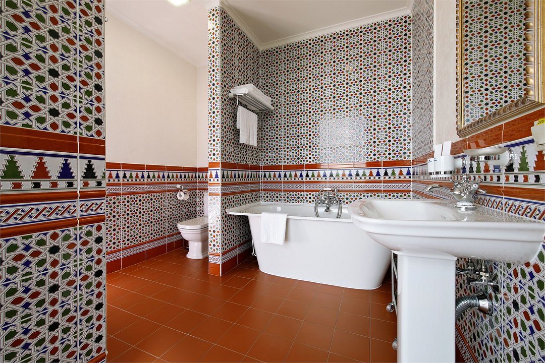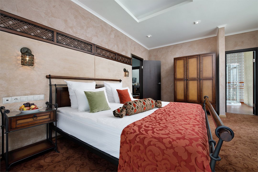 Особенности номера: двухкомнатный номер с оригинальным интерьером, состоящий из уютной гостиной и комфортабельной спальни. Создать атмосферу восточной сказки помогают подвесные фонари из металла и цветного стекла, всевозможные арки, деревянные комоды, затейливая ковка и узорчатые стены. Номер оборудован двумя раздельными санузлами.
