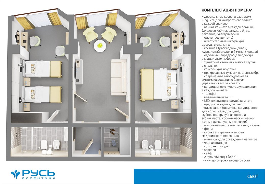 Особенности номера: трехкомнатный сьют семейный с просторной гостиной и двумя уютными спальнями с элегантным и современным дизайном. Номер оборудован двумя просторными ванными комнатами с душевой и просторным отдельным гардеробом для одежды с гладильным набором.
