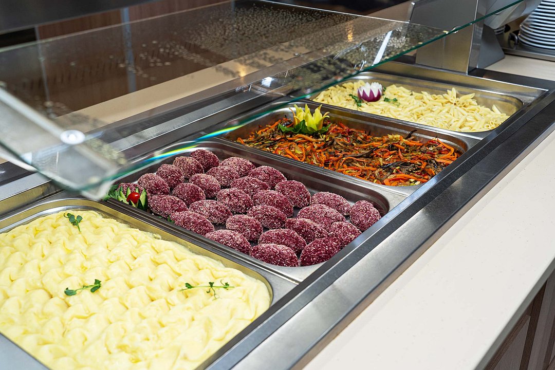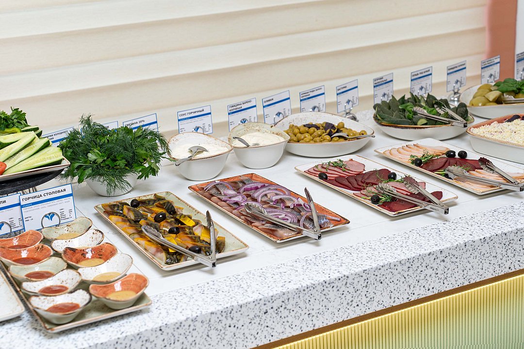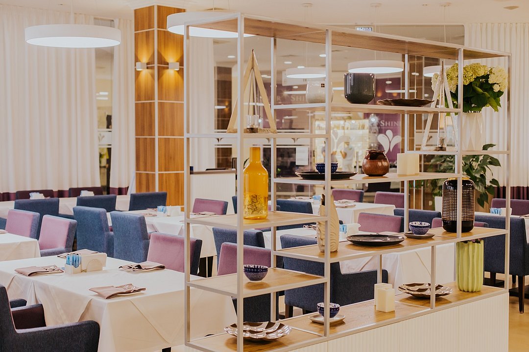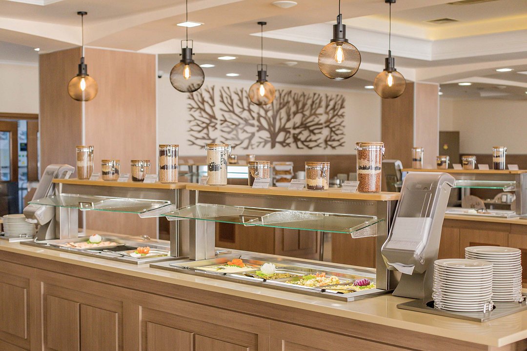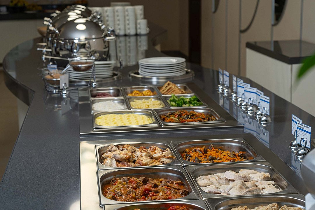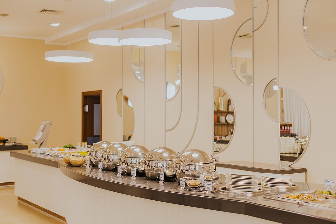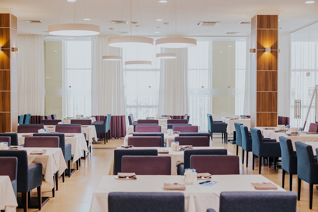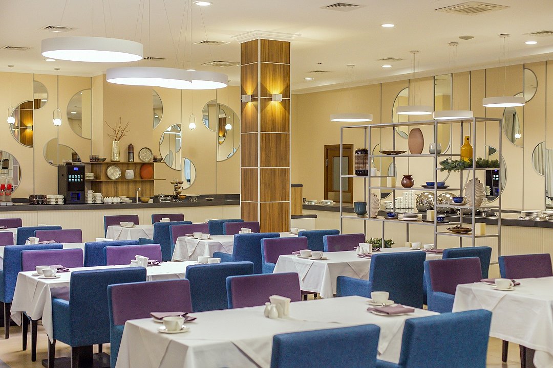 В санатории работают лобби-бар «Синатра», вип Зал «Сан-сити», вип Зал диетического питания «Диет-холл», обеденный зал «Скандинавия» и ресторан европейской кухни «Дольче Вита». Отдыхающие могут заказать себе комплексное питание, в том числе и диетическое, перекусить в течение дня, продегустировать коктейли и напитки, предусмотрено и детское меню с гипоаллергенным питанием.