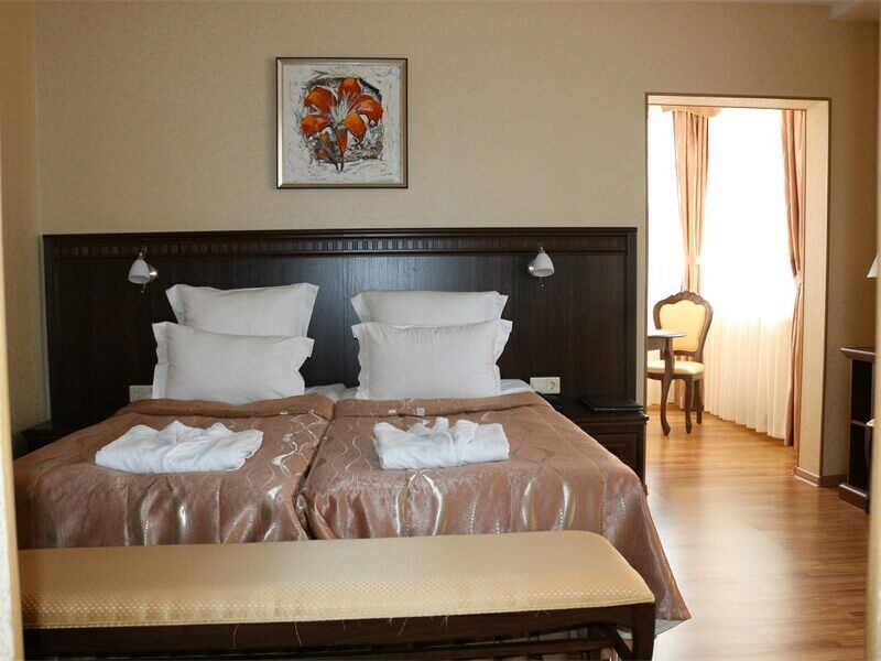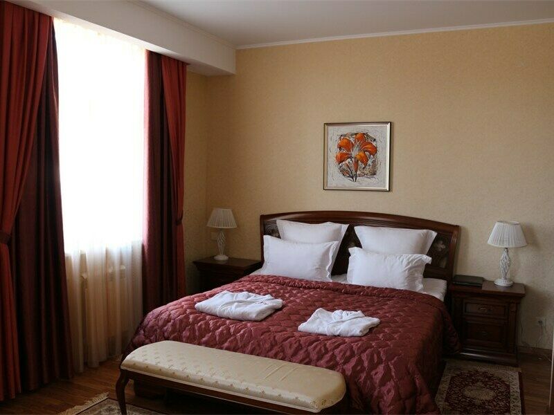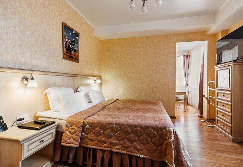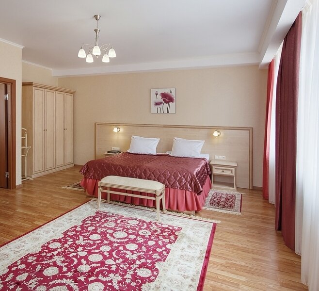 душевая кабина, биде, фен, косметическое зеркало, халаты, тапочки, набор полотенец, набор элитной косметики «Аква», холодильник, электрочайник, набор посуды для минибара, сейф, телевизор
