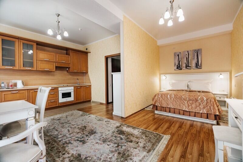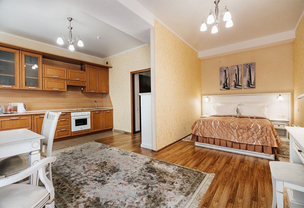 душевая кабина, биде, фен, косметическое зеркало, халаты, тапочки, набор полотенец, набор элитной косметики «Аква», холодильник, электрочайник, набор посуды для минибара, сейф, телевизор, кондиционер, зона кухни с электроплитой, микроволновой печью