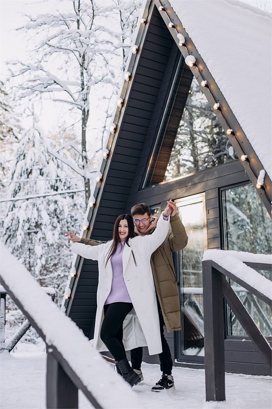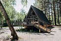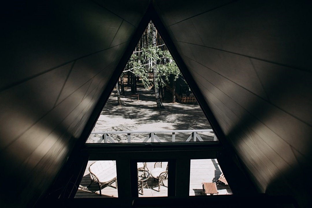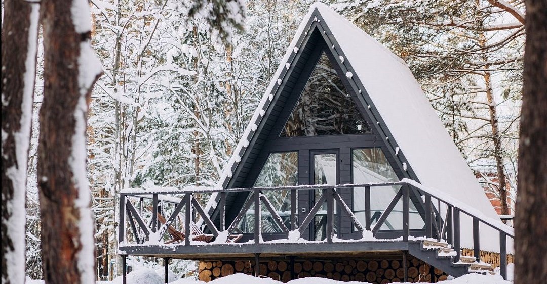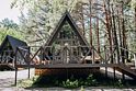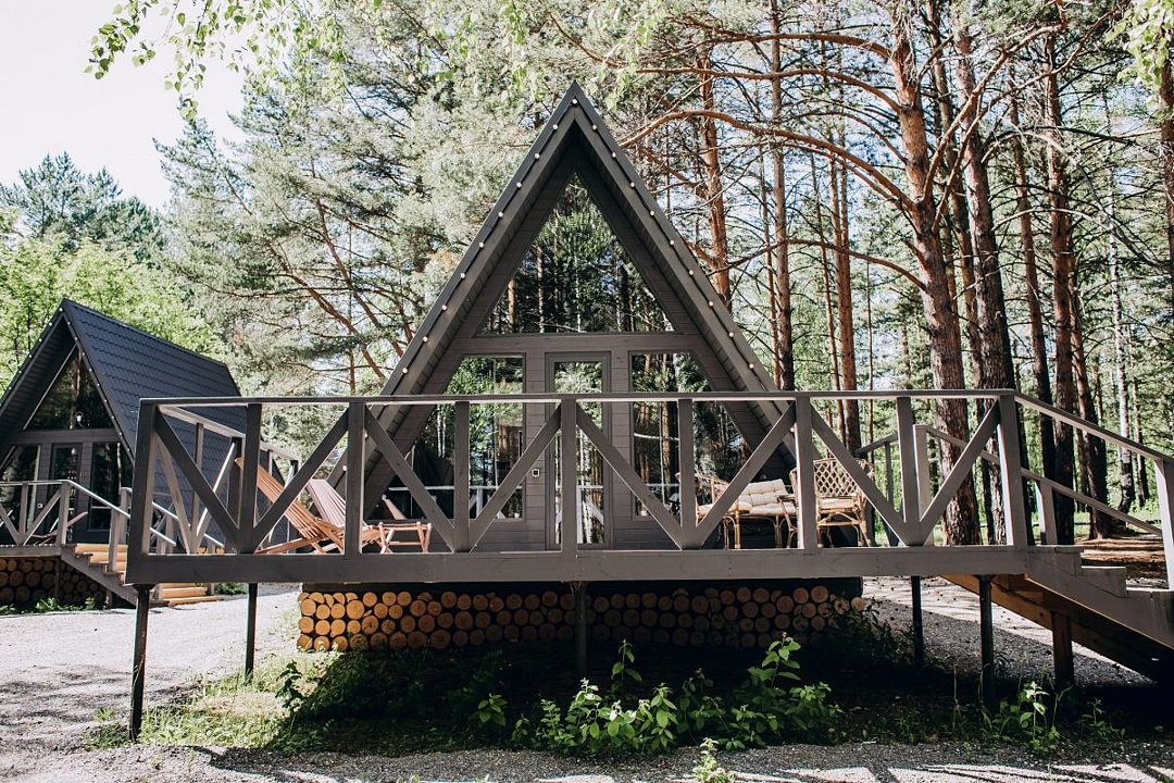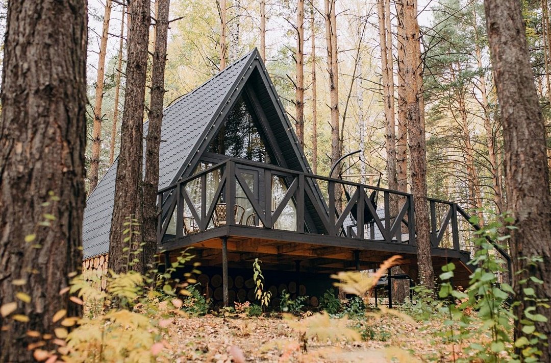 Уютные домики А-фреймы с панорамным остеклением и спальней на втором этаже. На берегу реки, внутри леса.