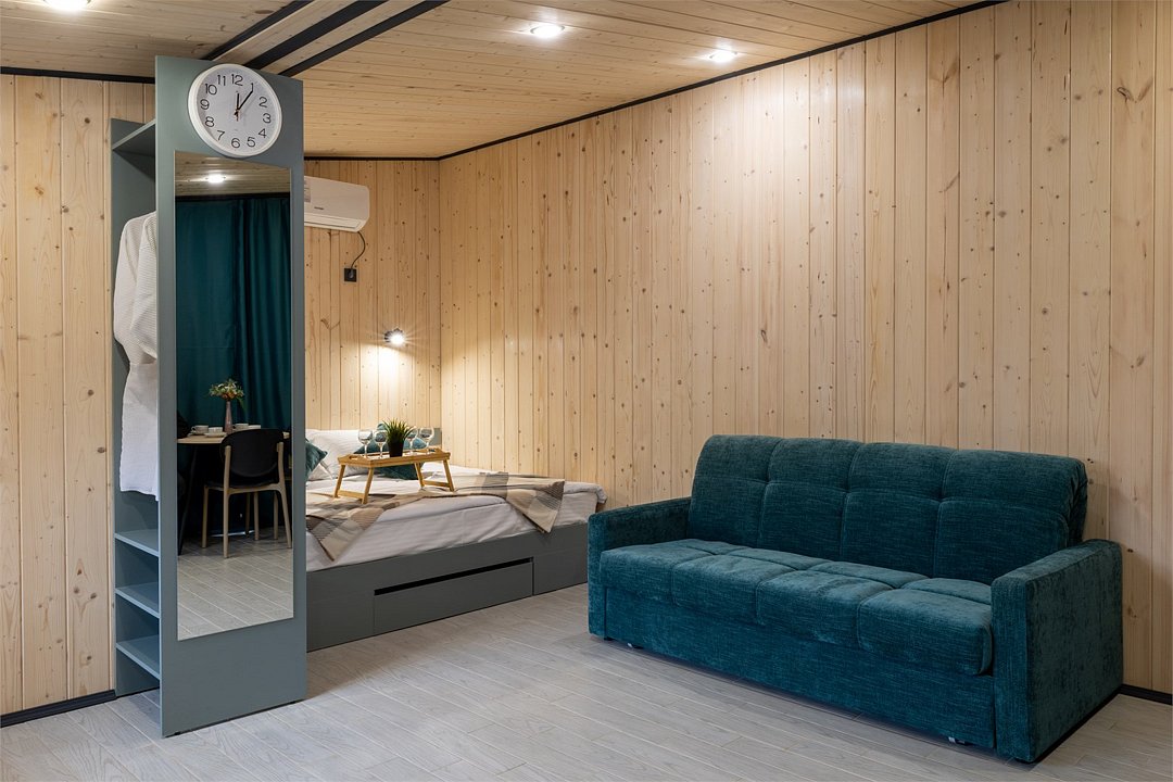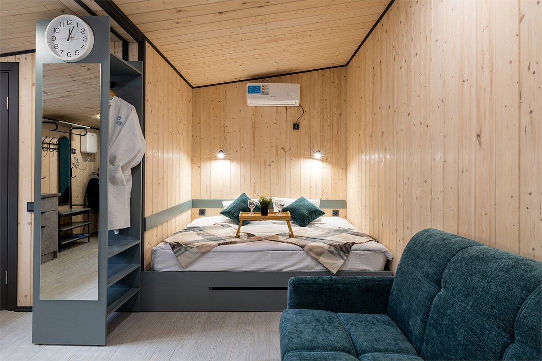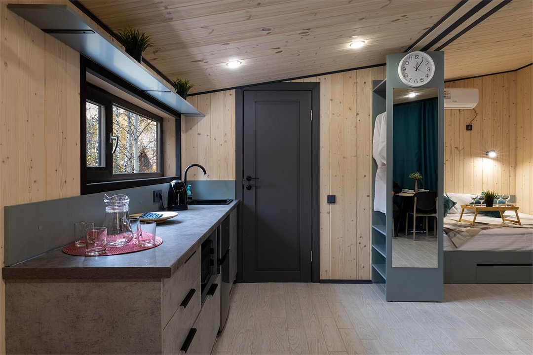 Тёплый эко‑дом в природном стиле с кухней, двуспальной кроватью, раскладным диваном и открытой террасой. Возможно размещение дополнительно еще 2-х человек.