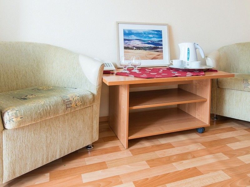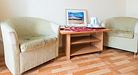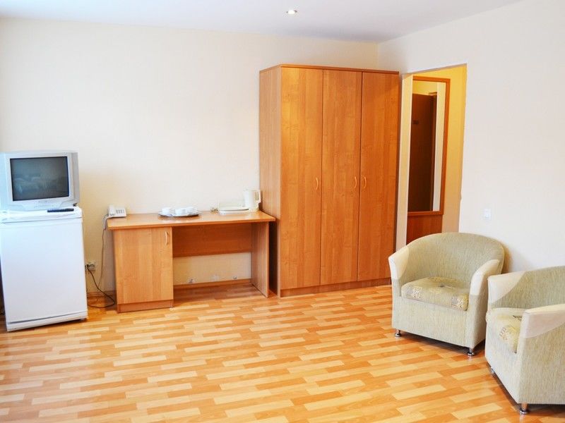 28 м2, две 1-спальные кровати, диван, журн. столик, стулья, Х, ТВ, чайник, шкаф, фен, ванна.