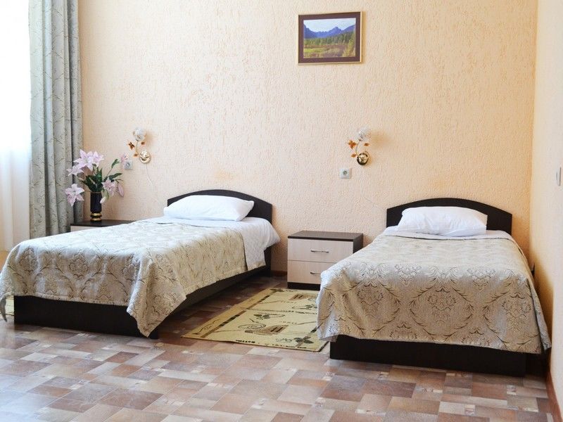 24 м2, две 1-спальные кровати, шкаф, прикроватные тумбочки, стол, стулья, ТВ, Х, фен, чайник, с/у, ванна.