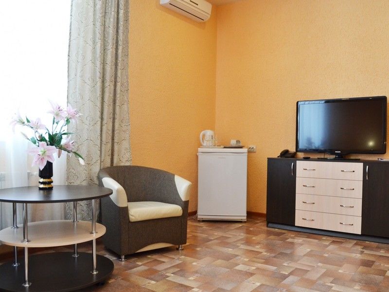32 м2, 2-спальная кровать, прикроватные тумбочки, светильник, стол, кресла, шкаф, ТВ, Х, кондиционер, чайник, телефон, с/у, ванна.