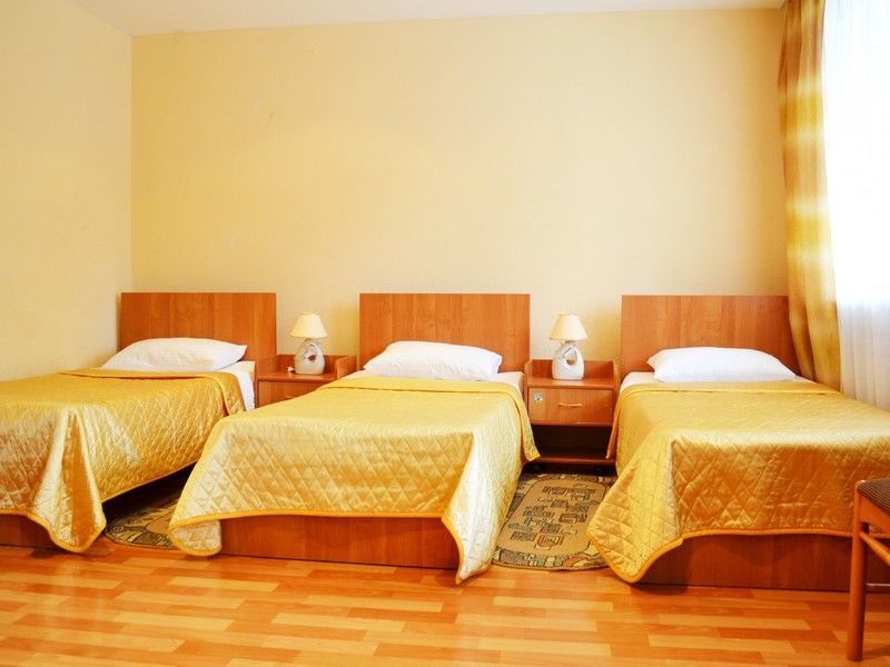 28 м2, три 1-спальные кровати, кресло, стол, Х, ТВ, шкаф, ванна.