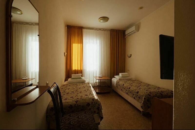 В каждом номере вас ждет: удобные односпальные кровати, легко трансформирующиеся в одну двуспальную, вместительный двухстворчатый шкаф с плечиками для одежды, холодильник для хранения продуктов и напитков, телевизор с пультом для приятного времяпрепровождения, журнальный столик для вечернего чаепития, тумбочка, стул и зеркало.