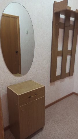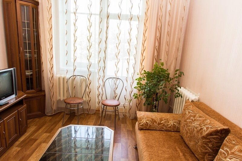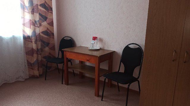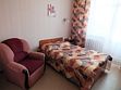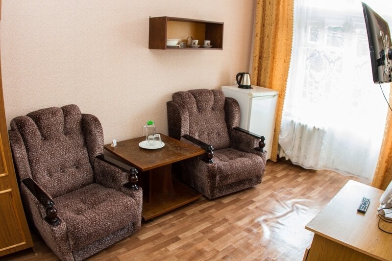 В номере: мягкий диван, 2 тумбы, шкаф-этажерка, шкаф для одежды, 4 стула, стол с встроенной тумбой.