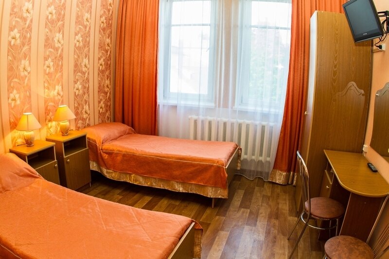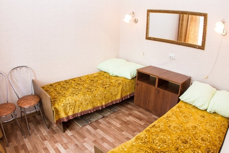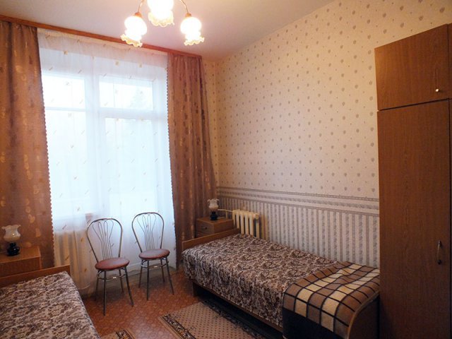 Состав номера: окно с возможностью открывания, санузел совмещенный (душ + туалет). В номере: 2 отдельных кровати, 2 стула, кресло, 2–3 тумбочки.