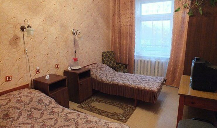 Состав номера: окно с возможностью открывания, санузел совмещенный (душ + туалет). В номере: 2 отдельных кровати, 2 стула, кресло, 3 тумбочки.