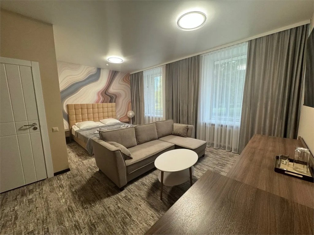 Номер категории люкс с оптимальным набором удобств, одной двухспальной кроватью и раскладным диваном. В номере есть телевизор, холодильник, совмещенный сан. узел, душевая кабина, шкаф для хранения ваших вещей, комод, пластиковые окна, электрический чайник.