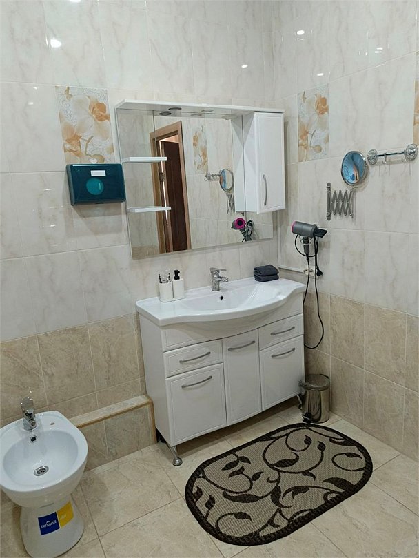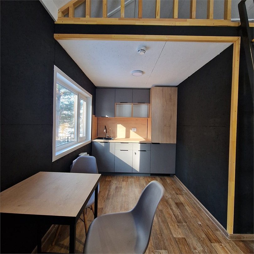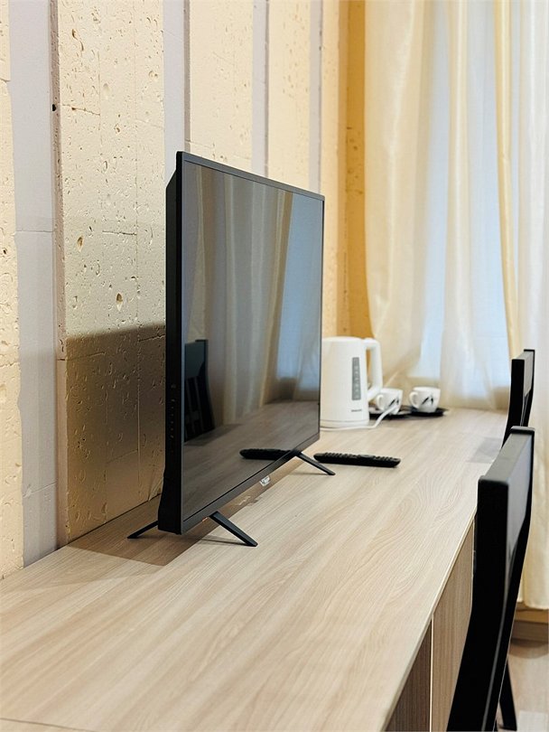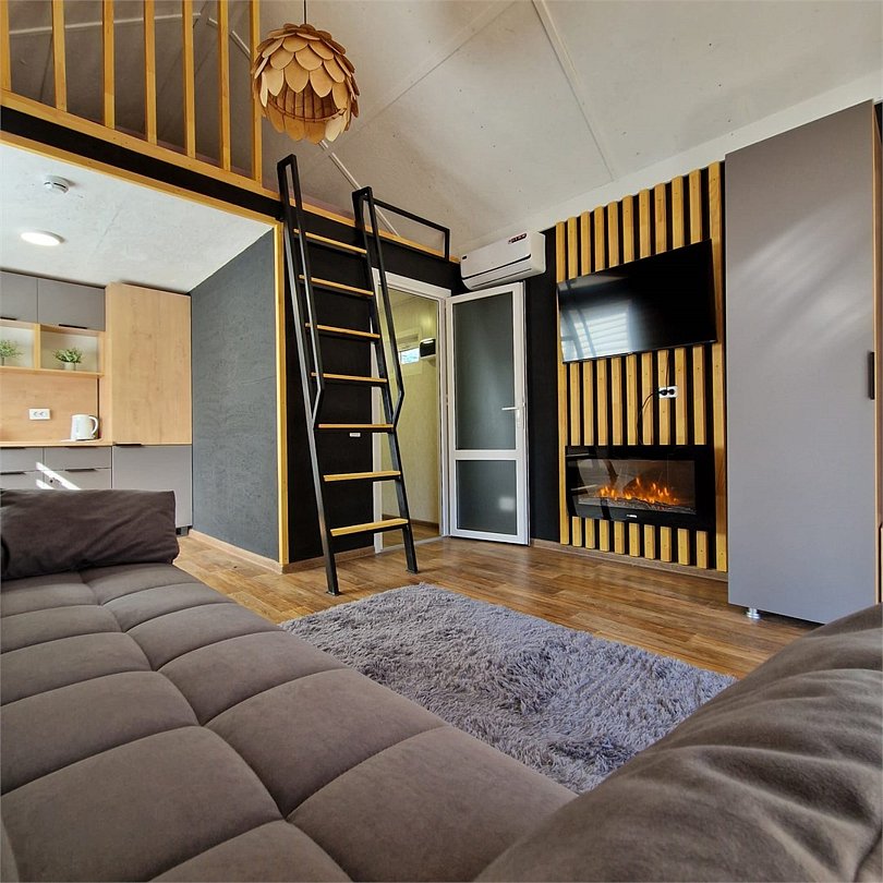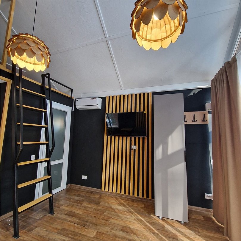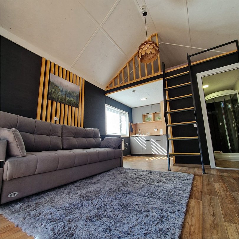 В зоне гостиной расположены: диван, шкаф и большой смарт телевизор. Кухня оснащена микроволновой печью, холодильником, чайником, посудой и столовыми приборами. В спальной зоне удобные ортопедические матрасы, мягкие подушки и теплое одеяло.Услуги и удобства