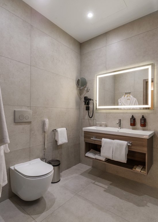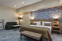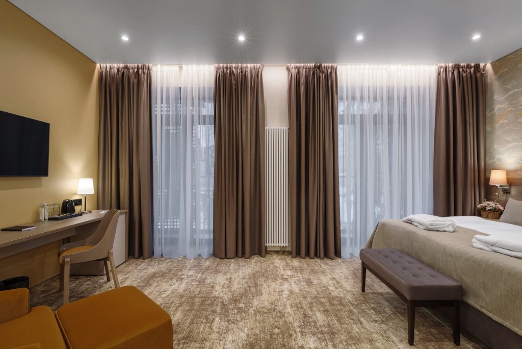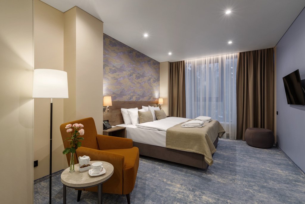 Номер Люкс представлен двумя комнатами: спальней и просторной гостиной с зоной отдыха с диваном, окна с панорамным видом и террасой.