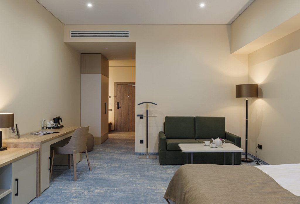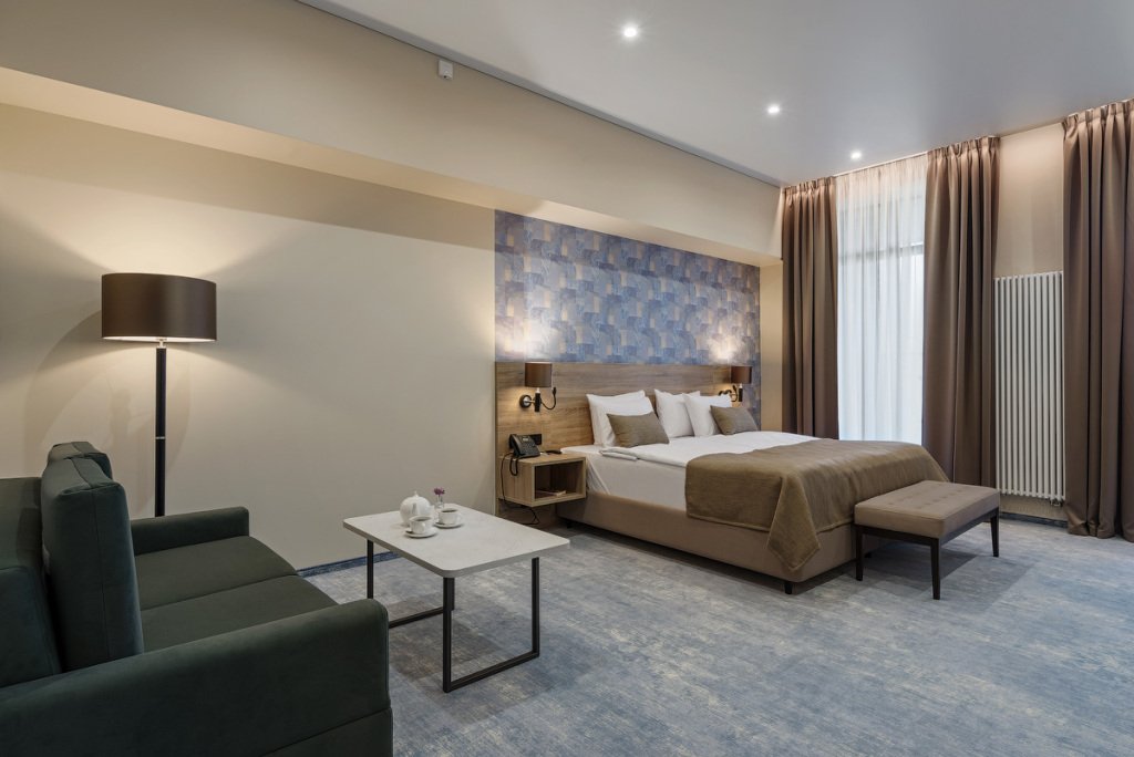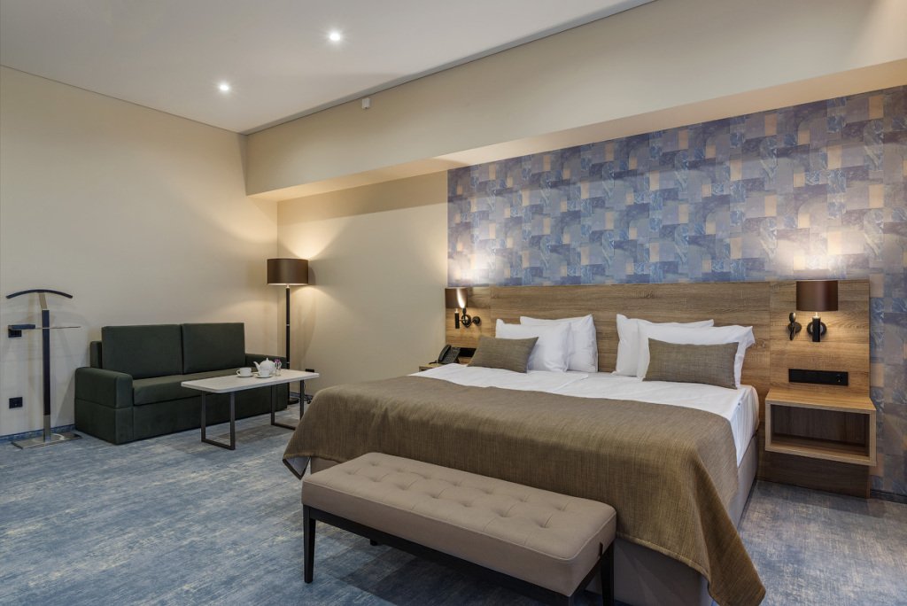 Люкс однокомнатный с двуспальной кроватью или двумя раздельными кроватями и диваном (две раздельные кровати предоставляются по запросу и при наличии возможности).