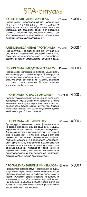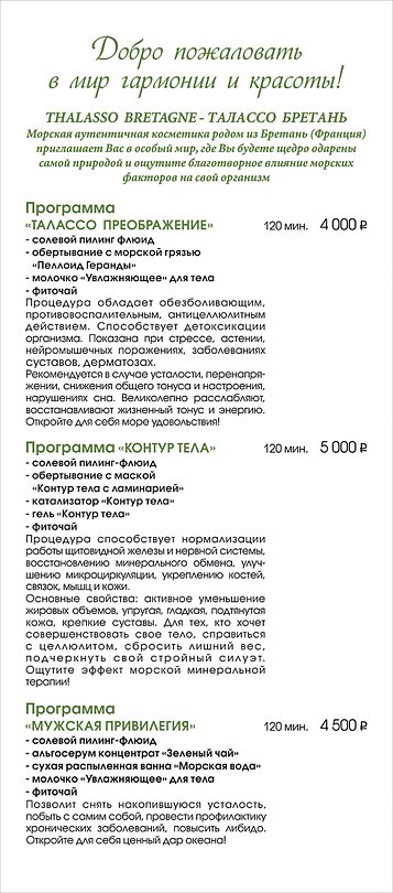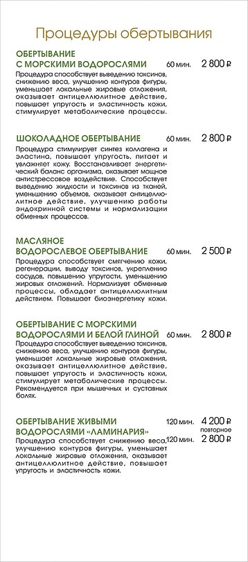 Курсы обертываний и комплексных процедур используют силу моря и природных компонентов — ламинарии, морских грязей, голубой и белой глины, масляные, шоколадные и медовые обертывания, талассотерапию и карбокситерапию. Они способствуют детоксикации, улучшению микроциркуляции и минерализации тканей, коррекции силуэта, восстановлению кожи и общего самочувствия.