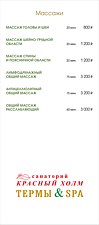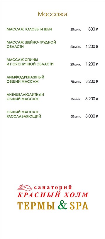 В Санатории Красный холм предлагают полный спектр SPA‑ритуалов, уходов и массажей от опытных мастеров телесных практик, которые эффективно снимают физическую усталость и эмоциональное выгорание, возвращая жизненный тонус и душевное равновесие. В программу входят массаж головы и шеи, шейно‑грудной и поясничный сеансы, лимфодренаж, антицеллюлитные и расслабляющие техники.