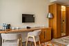Тридцать пять квадратных метров, до четырех мест (два основных + два дополнительных): платяной шкаф, письменный стол, туалетный столик, мягкая мебель, телевизор, холодильник, санузел с душевой кабиной, халаты, тапочки, фен, средства гигиены, чайная станция, набор посуды.