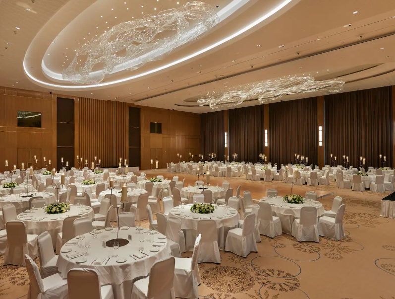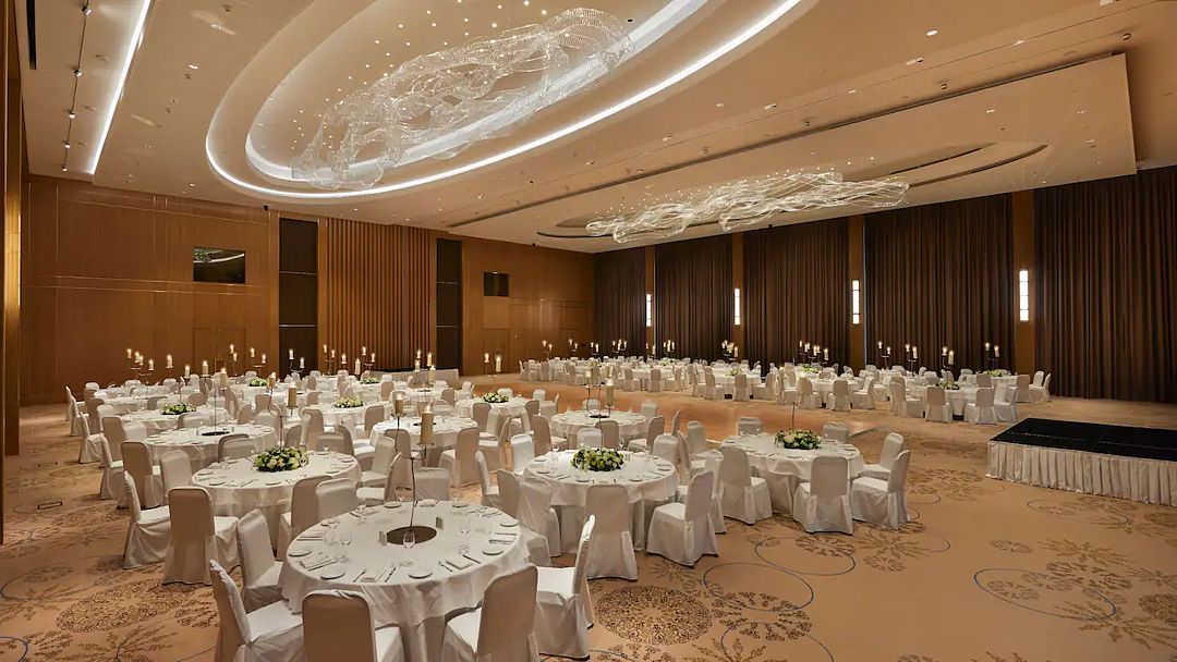 Настоящая мечта организаторов мероприятий - банкетный зал площадью 855 кв. м с входом из отеля и с улицы представляет собой универсальное помещение с передовой аудио- и видеотехникой. Банкетный зал вмещает до 800 человек при театральной рассадке, 600 человек при элегантном приеме и 460 человек при банкетной рассадке.
